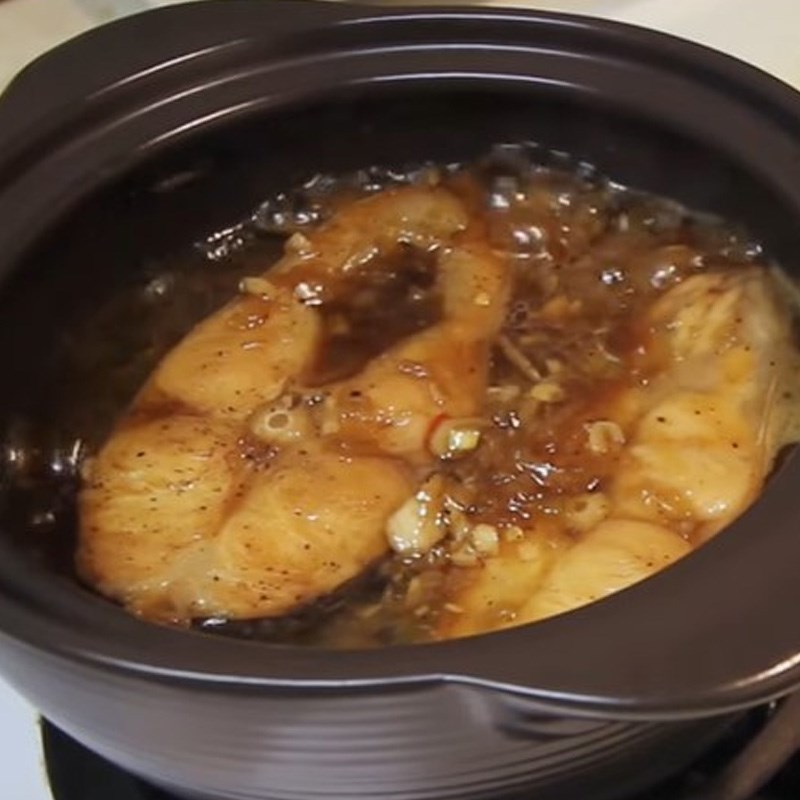 - Xếp cá bông lau lên trên, rưới nước ướp còn lại vào nồi.