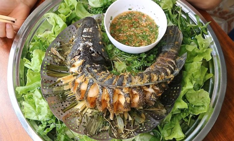 - Cá quả hấp bia cuốn bánh tráng: ăn kèm rau sống, bún, chấm nước mắm me – cực kỳ hấp dẫn.