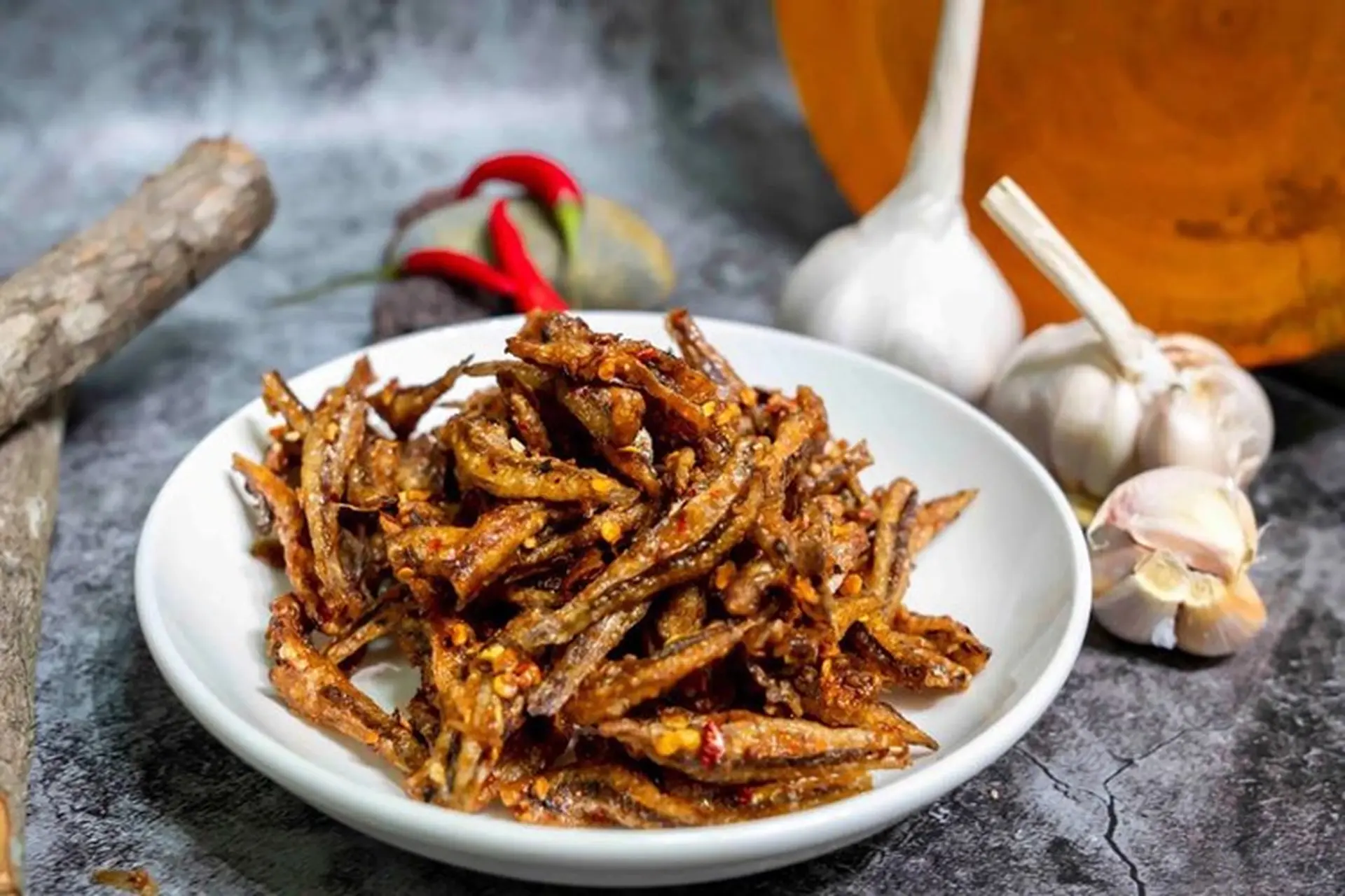 - Cá cơm chiên tỏi ớt: Phi tỏi ớt cho vàng, trộn cùng cá chiên khô.