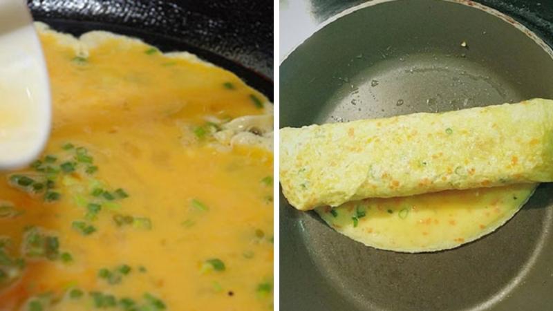 - Đổ toàn bộ hỗn hợp trứng vào chảo, nghiêng nhẹ chảo cho trứng trải đều.