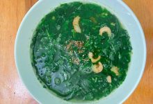 • Khi canh đã hoàn thành, cho rau ngổ, hành lá và ngò gai vào nồi để thêm hương thơm. Múc ra tô và thưởng thức ngay khi còn nóng.