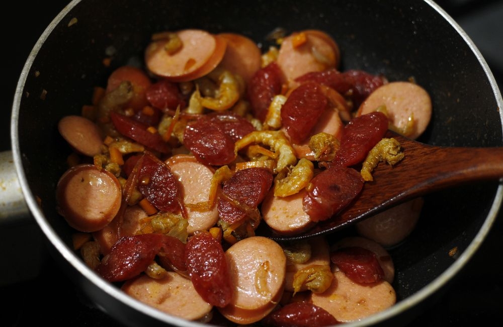 Tôm khô, củ cải, cà rốt, xúc xích cho vào chảo đã phi tỏi, đảo đều, nêm gia vị nhẹ. Hỗn hợp này chính là phần nhân phong phú nhất, giúp xôi mặn có chiều sâu về hương vị.